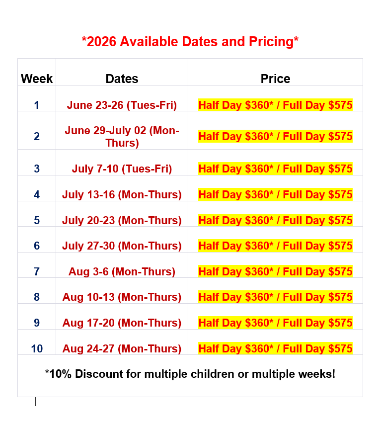 FULL DAY CAMP 9am – 4pm $575 per session (lunch included each day)